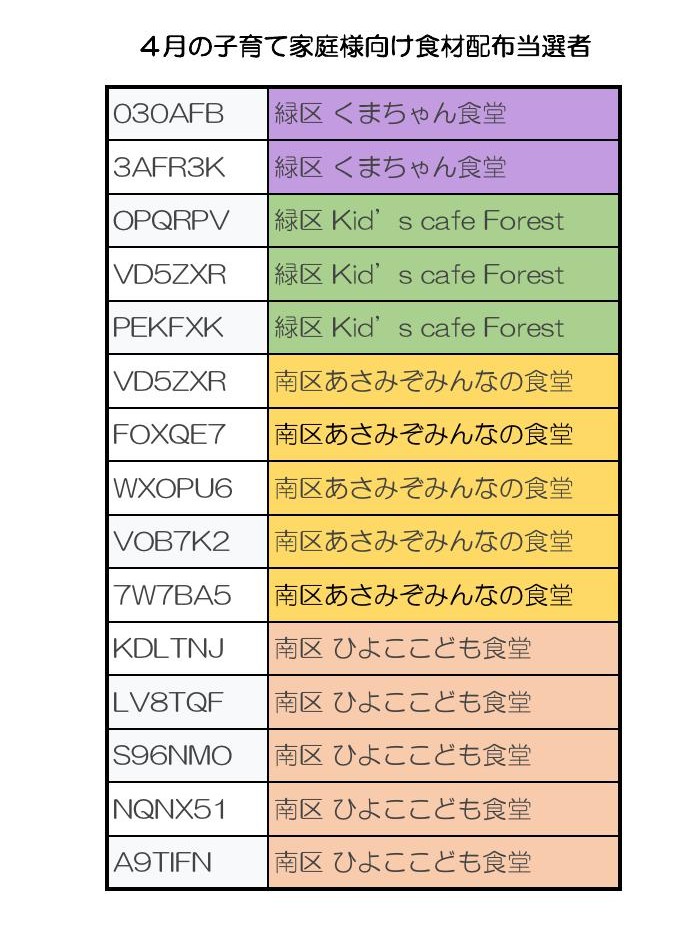 4月各こども食堂にて食材配布当選者の発表